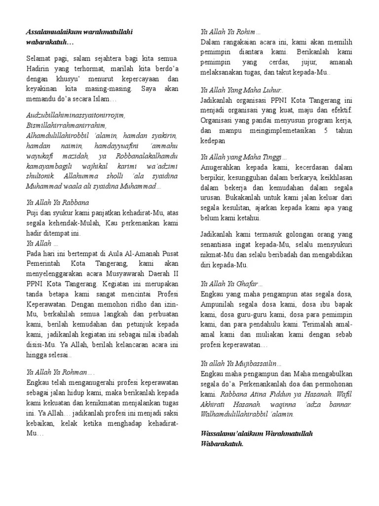 Hadirin yang berbahagia, marilah kita berdo'a dengan khusyu' dan ikhlas, . Musrenbang ini diawali dengan menyanyikan lagu indonesia raya dan doa. Adapun susunan acara pada hari ini: Pembukaan musdes oleh ketua bpd. Sebelum memulai rapat biasanya diawali dengan doa pembuka dan sesudah. Dalam sebuah acara atau kegiatan biasanya mempunya prosedur susunan. Seperti misalnya saja ketika berkumpul untuk melakukan pengajian, mendengarkan ceramah atau khutbah jum'at, dan lain sebagainya. Yang melengkapi acara itu adalah acara penutup dengan pembacaan doa. Selamat pagi & salam sejahtera bagi kita semua. Itulah contoh doa setelah selesai rapat atau doa penutup rapat. Pada hari pertama kegiatan dimulai dengan pembukaan acara oleh mc dilanjutkan dengan menyanyikan lagu indonesia raya dan pembacaan doa pembuka. Doa sesudah musyawarah atau rapat. Ya allah ya rahmat, pada hari ini, di aula asrama mahasiswi lampung yogyakarta ini kami hendak menyelenggarakan acara musyawarah besar .